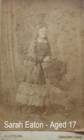 We do not know when the family moved to South Africa, but we do know that Sarah Eaton left Port Alfred Sunday School in May 1874, when she was presented with a Bible which is in my possession. I have a photo of her, aged 17, taken in Grahamstown, Eastern Cape.