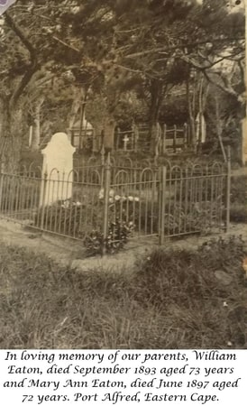 They both died in Port Alfred, Eastern Cape and were buried in the West Bank Cemetery in that town. They had a daughter, SARAH ELLEN EATON, born October 1859 in the Romford District, Barking, Essex, England. She was baptized on 20/06/1860 in the Church of England Parish Church, Barking - probably St Margaret´s. Barking is in the East end of London.
